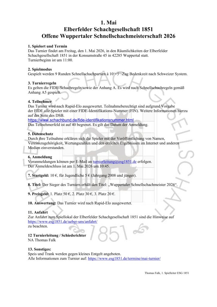 Nach einer längeren Pause möchten wir die Tradition des Mai-Turnieres (vormals Heinz-Booth-Turnier) wieder aufgreifen. Viele Schachfreunde – in der Spitze hatten wir über 400 Teilnehmer – werden sich noch an das jährlich am 1. Mai ausgetragene Mannschaftsblitzturnier erinnern.